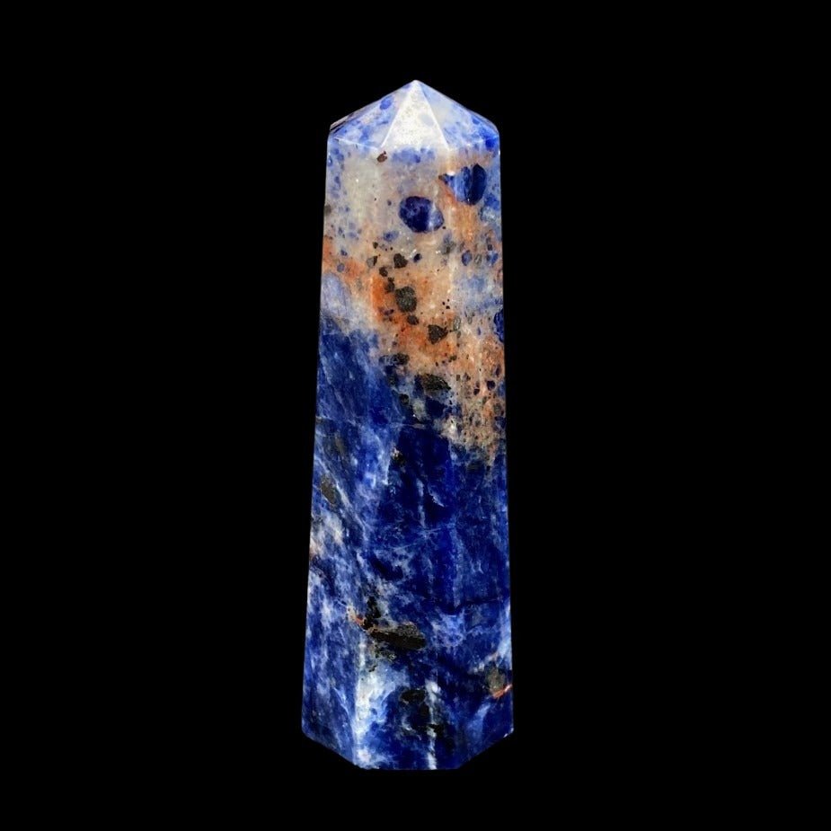 This Sodalite tower Is a gorgeous specimen. It has a swirl of marbled white, light blue, dark blue, and orange. It would be a great addition to any rockhounds collection.