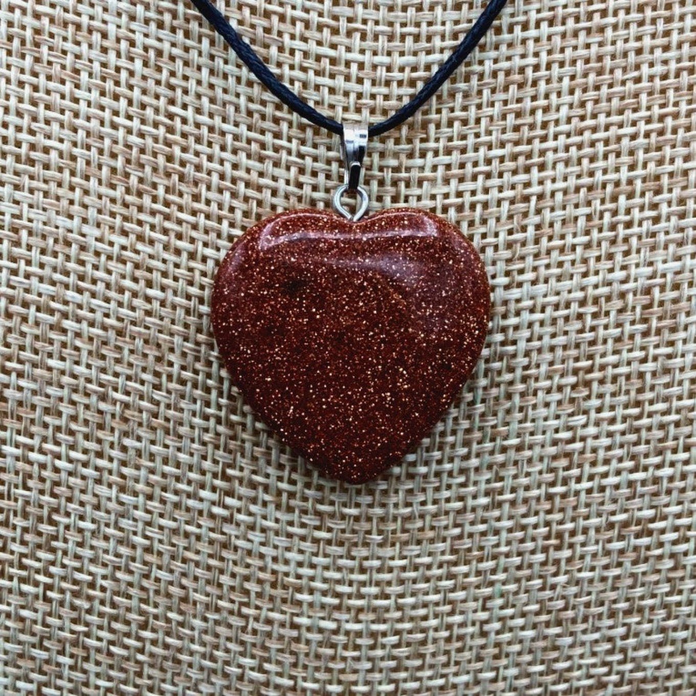 This Goldstone heart necklace would make a lovely gift. The pendent is made out of Goldstone, which is a warm shimmering copper color. The pendent is on a black cord, that is adjustable.