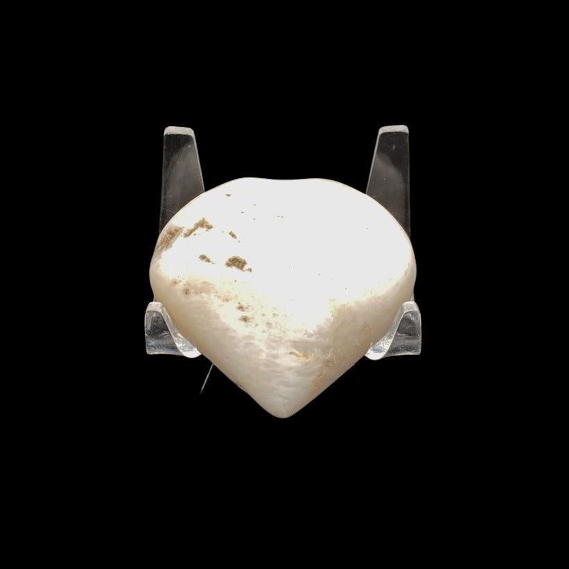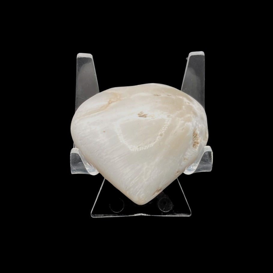 This Scolecite heart stone marbled white, cream, and some grey, gives it a soft look. It almost looks like a marshmallow if it was not for it being polished and shiny.