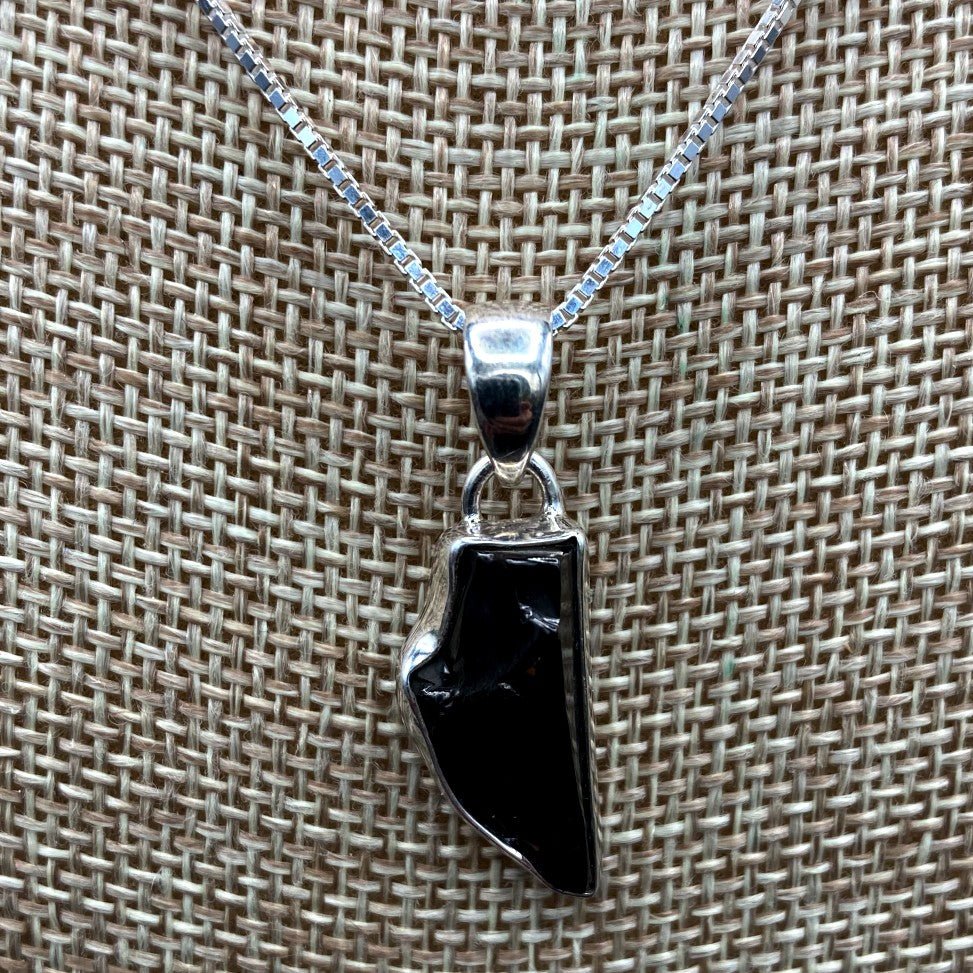 Protect yourself against harmful electromagnetic frequencies (EMF) and radiation with this wearable Shungite pendant. This is a elegant polished Shungite pendant on a beautiful sterling silver box chain. The Shungite pedants back and base is sterling silver as well.