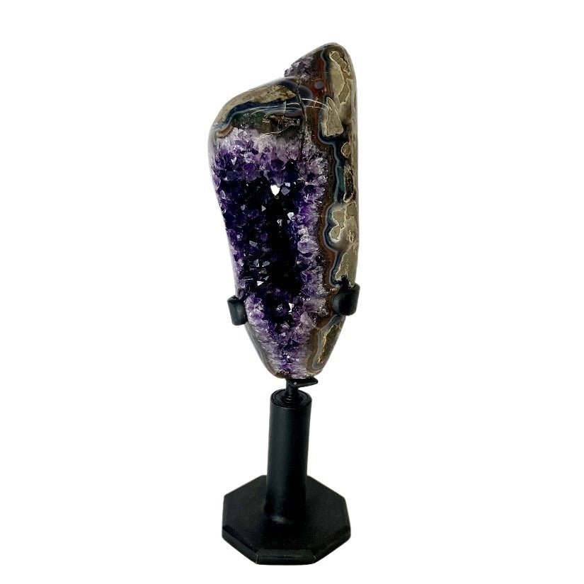 Give any room a stylish touch with this striking Purple Amethyst on Iron Stand. The statement piece features a large amethyst cluster with an intricate iron stand, adding a sophisticated and luxurious feel to any home decor. Ideal for those looking to make a bold decorative statement.