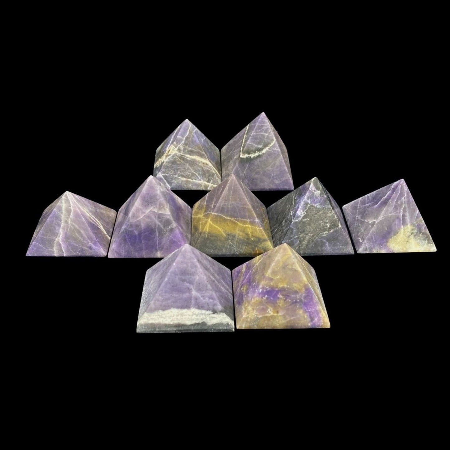 This listing is for a single carved stone pyramid. Polished Purple Opal pyramid. Also known as Purple Morado, "Morado" means purple in Spanish, carved purple stone. Unlike some of the purple Opals counter parts, it does not exhibit color play (opalescence). The purple coloration is due to very small fluorite inclusions inside the silica and these inclusions can cause some purple opal to exhibit a blue to violet, fluorescent look under shortwave UV lights.