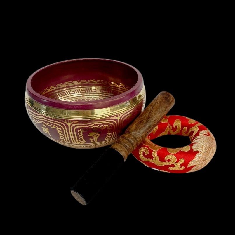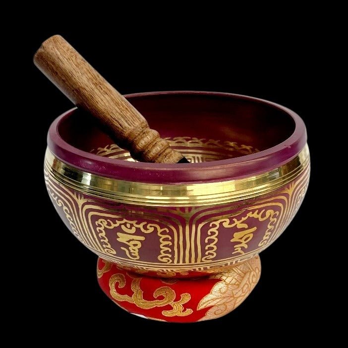 This is a Tibetan singing bowl. It was handmade and hand-painted in Nepal. This bowl is purple and has meaningful symbols also painted inside and the outside of the bowl in shiny gold paint. This singing bowl can be used as just home decor or can be used as a meditation tool.