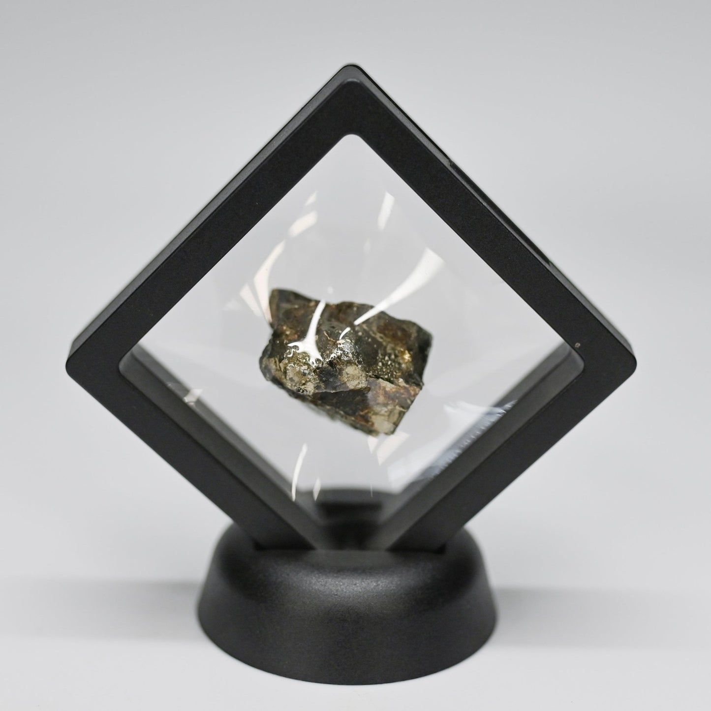 Are you looking for a unique budget decor idea? This features a beautiful Pyrite specimen enclosed in a black frame. The pyrite piece you receive will be similar to the one pictured. A black plastic frame and transparent plastic material hold the piece in place. The frame is hinged for easy access to the specimen.