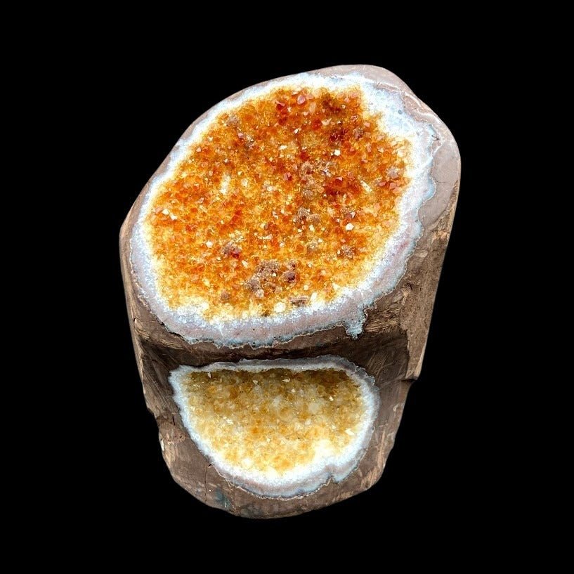 This one-of-a-kind 2-tone enhanced Citrine geode is hand-cut to form a unique Citrine specimen. The two-tone coloration and unique cut of the base create a stunning home decor accent piece that is sure to impress. Please take a moment to browse all the quartz druzy specimens we carry.