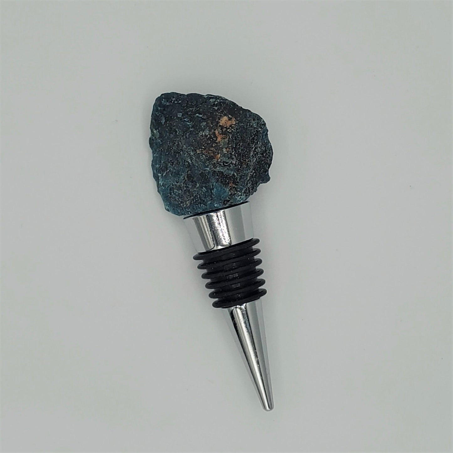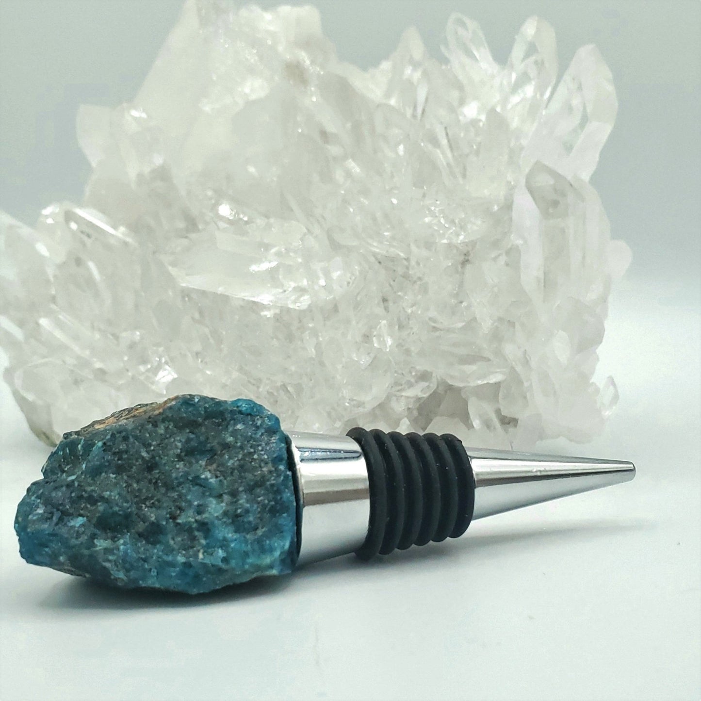 This bottle stopper features raw, uncut, or polished Apatite on a stainless-steel base. The beautiful, natural blue color of the Apatite is appealing and complements any decor. Consider giving this wine stopper as a birthday, housewarming, or thank-you gift.