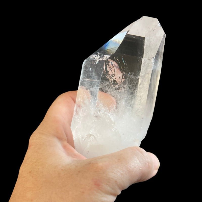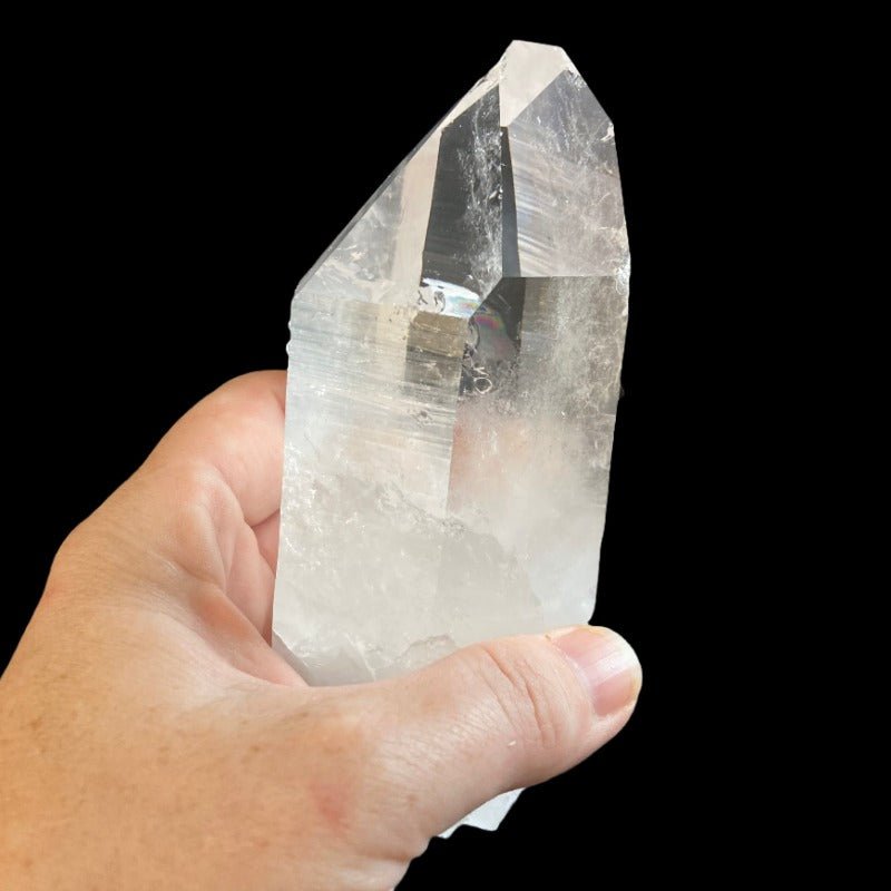 This type of crystal is absolutely spectacular. This Quartz crystal point is called a record keeper. On the point, if you look closely, you can see triangular markings that you can feel. These triangles can be upright, upside down, inverted, or indented. It is believed that those triangles are an Atlantean language, that it is stored data and information. This is where the name "Record Keeper" comes from.