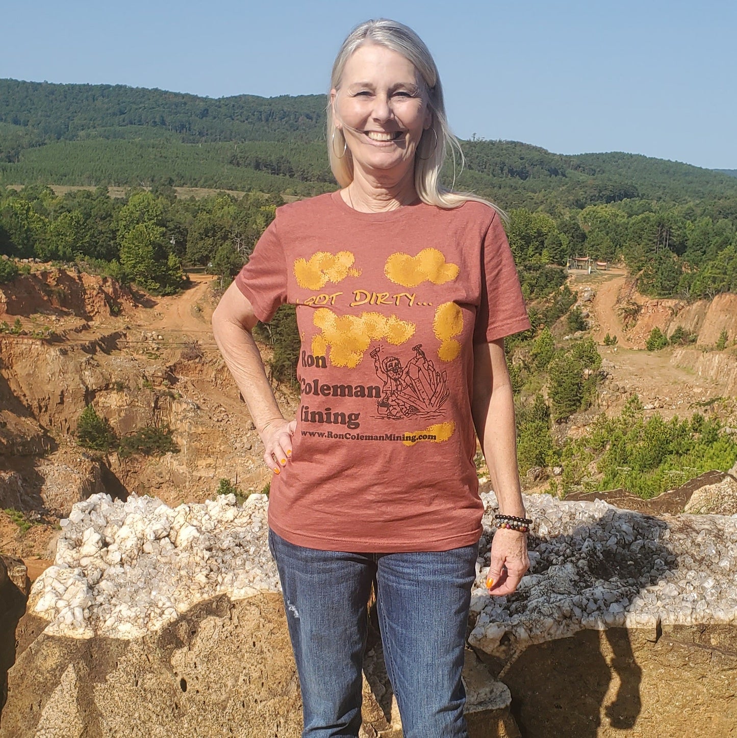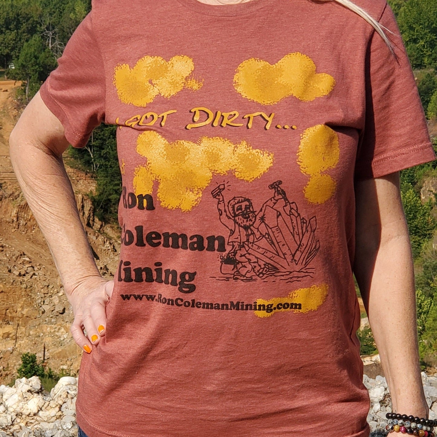 Remember your trip to Ron Coleman Mining to dig for crystals. Purchase this soft Clay Color t-shirt with crystal graphic and "I Got Dirty... at Ron Coleman Mining" Text. Unisex, 52% cotton and 48% polyester.