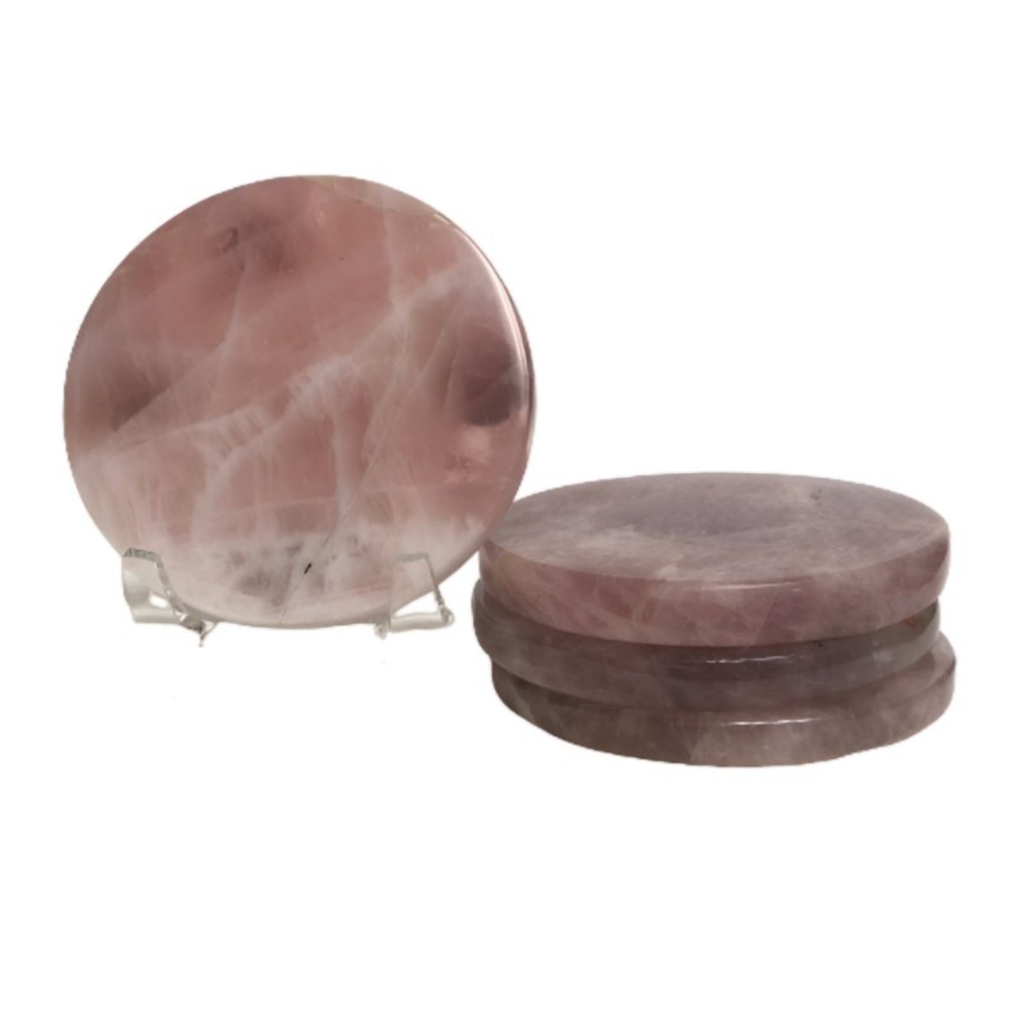 Beautiful Rose Quartz Coasters. These natural gorgeous pink rocks were custom carved in a circular shape. Notice the beautiful white veins and natural pink tones. Mined from Norcross- Madagascar quarry. 4-piece set, 79 mm diameter each piece. Each coaster has 4 non-slip Velcro rounds to keep the mineral coasters from slipping or scratching the furniture you are protecting from water stains. Shop our extensive collection of home goods and kitchen accessories