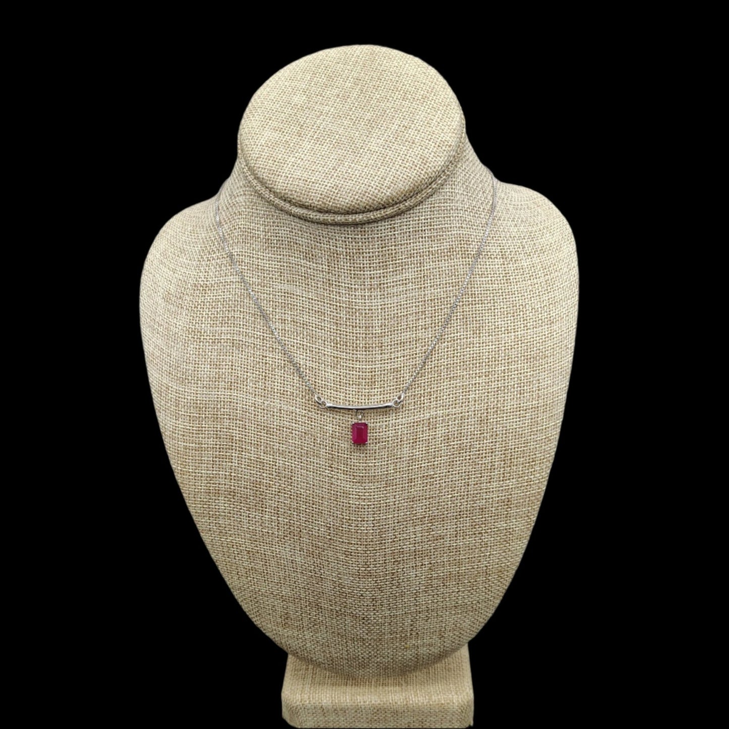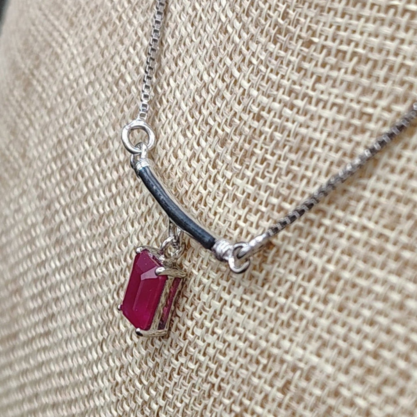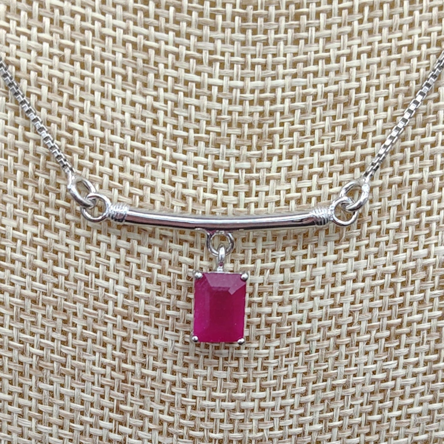 This necklace is a perfect gift for a minimalist or for someone born in July, which is this month's birthstone. The Ruby pendant features a sterling silver bezel and is a simple yet elegant rectangular shape. The chain this Ruby pendant sits on is Sterling silver and box chain.