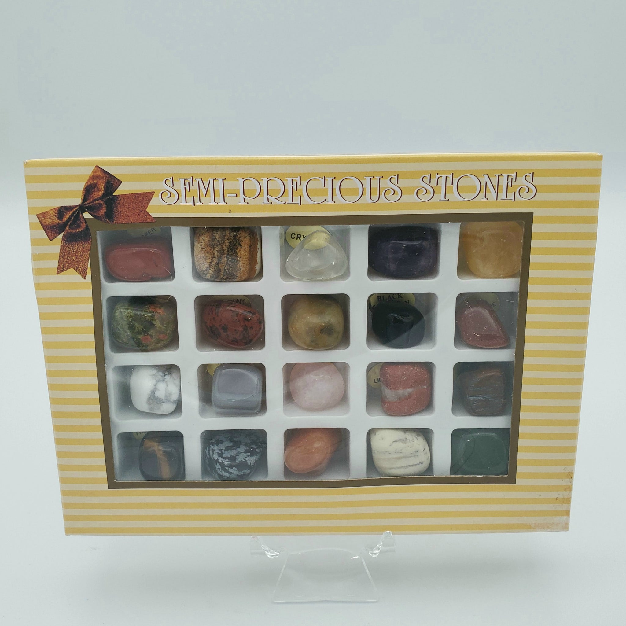 Contains the following 20 stones: Aragonite, Snowflake Obsidian, Mud Line Stone, Amethyst, Blue Stone, Fancy Jasper, Rose Quartz, Leopard Skin, Picture Jasper, Brecciated Jasper, White Howlite, Red Jasper, Sodalite, Crystal, Tiger Eye, New Jade, Mahagony Obsidian, Amazonite, Aventurine.