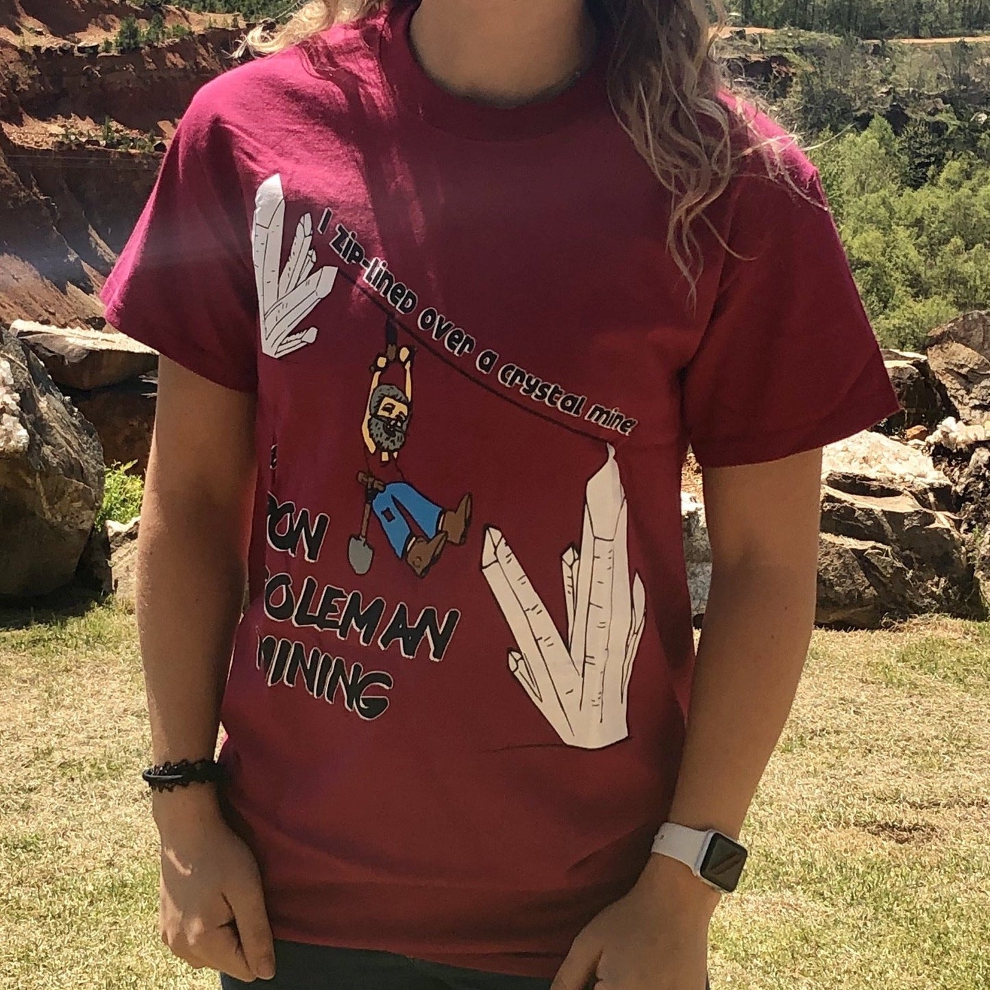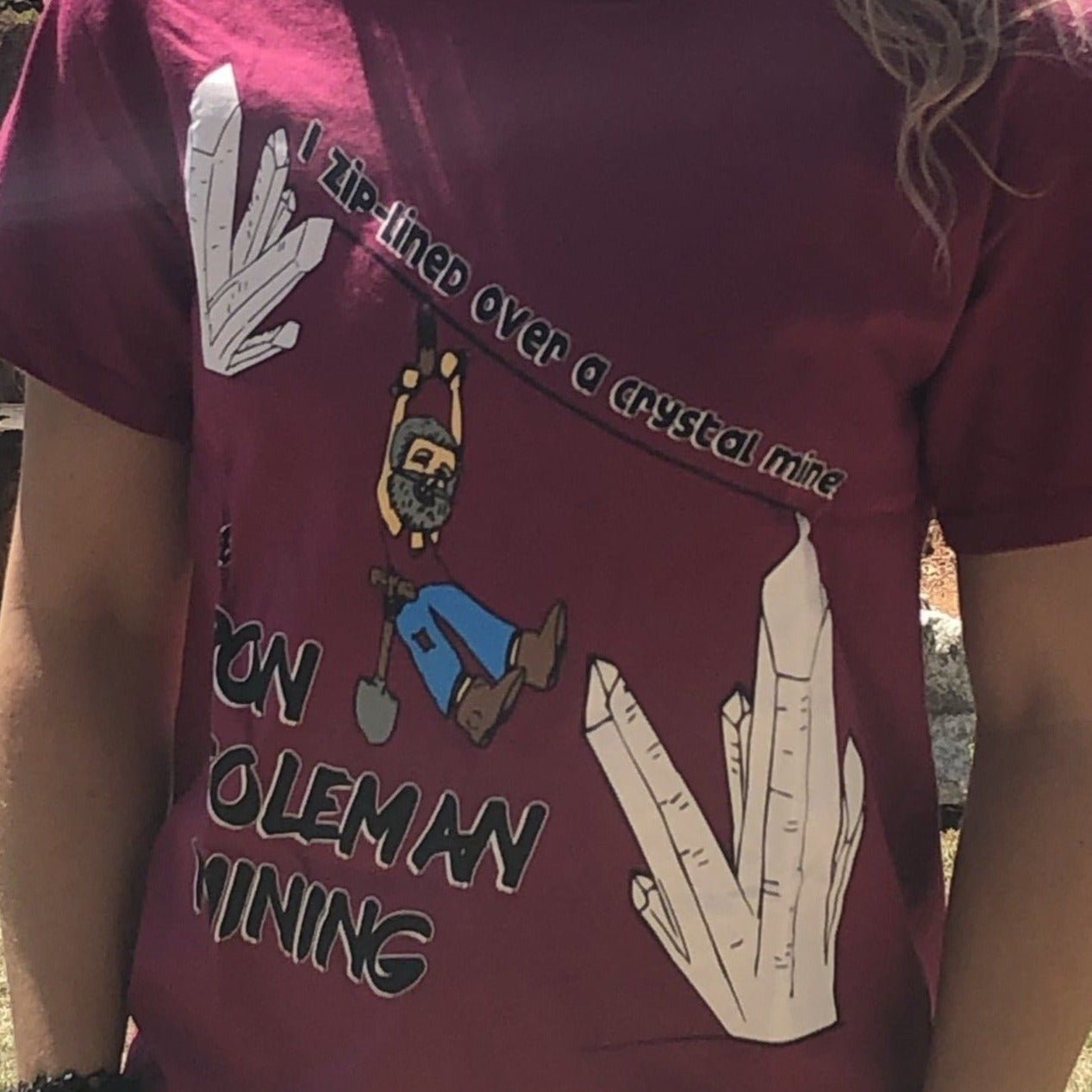 This beautiful berry color short-sleeved adult unisex t-shirt is a soft, 50/50 blend. The graphics feature a caricature miner zip-lining between two large white quartz crystal clusters, accompanied by the “I Zip-Lined Over A Crystal Mine” graphic over the zip-line. Wear this t-shirt and re-live your Ron Coleman Mining adventure.