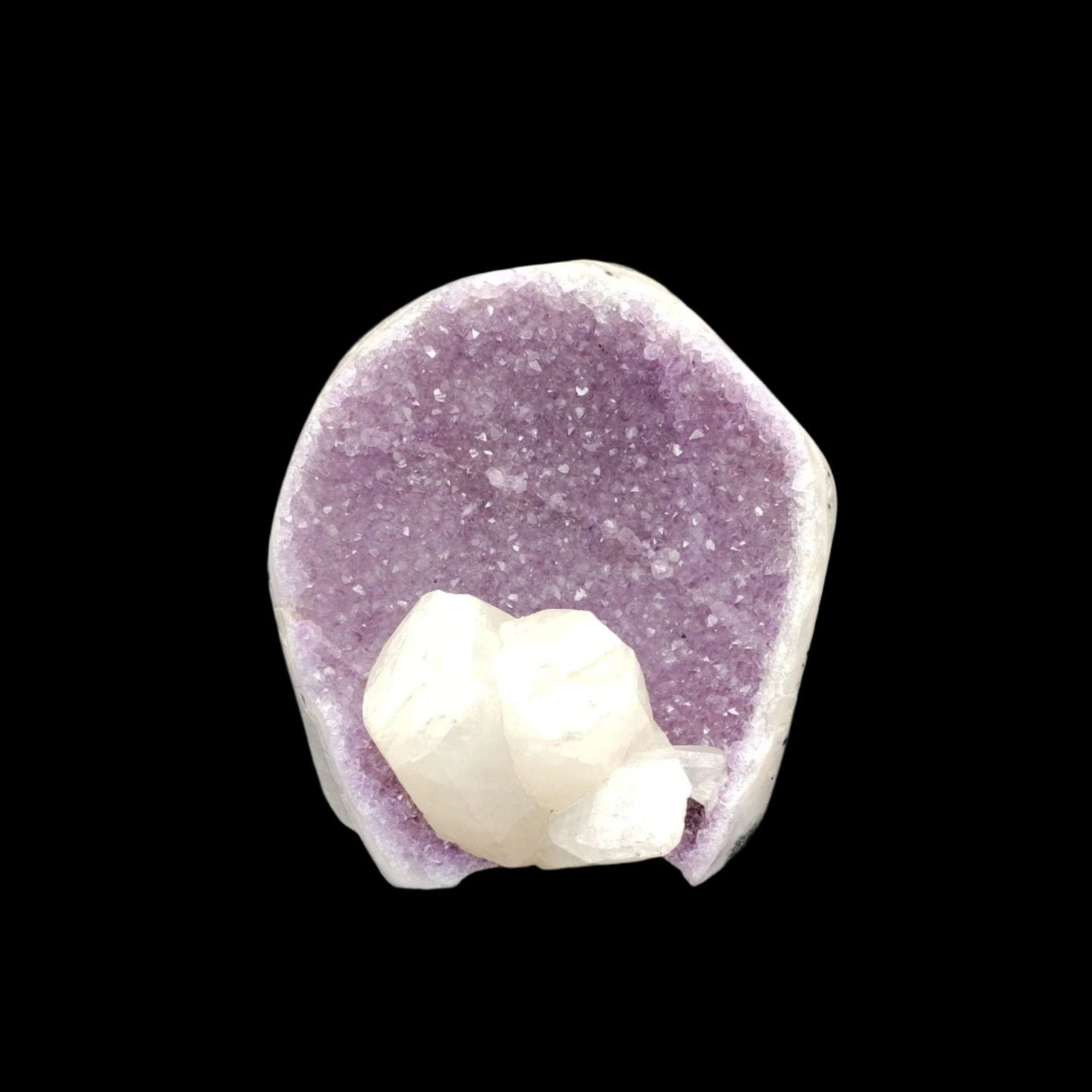 This small Amethyst geode with white Calcite is a must have. The pictures do not do it justice. Freeform means that this piece is irregular, not asymmetrical in the formation and shape.