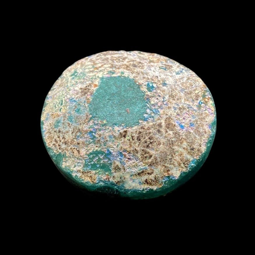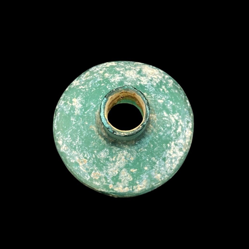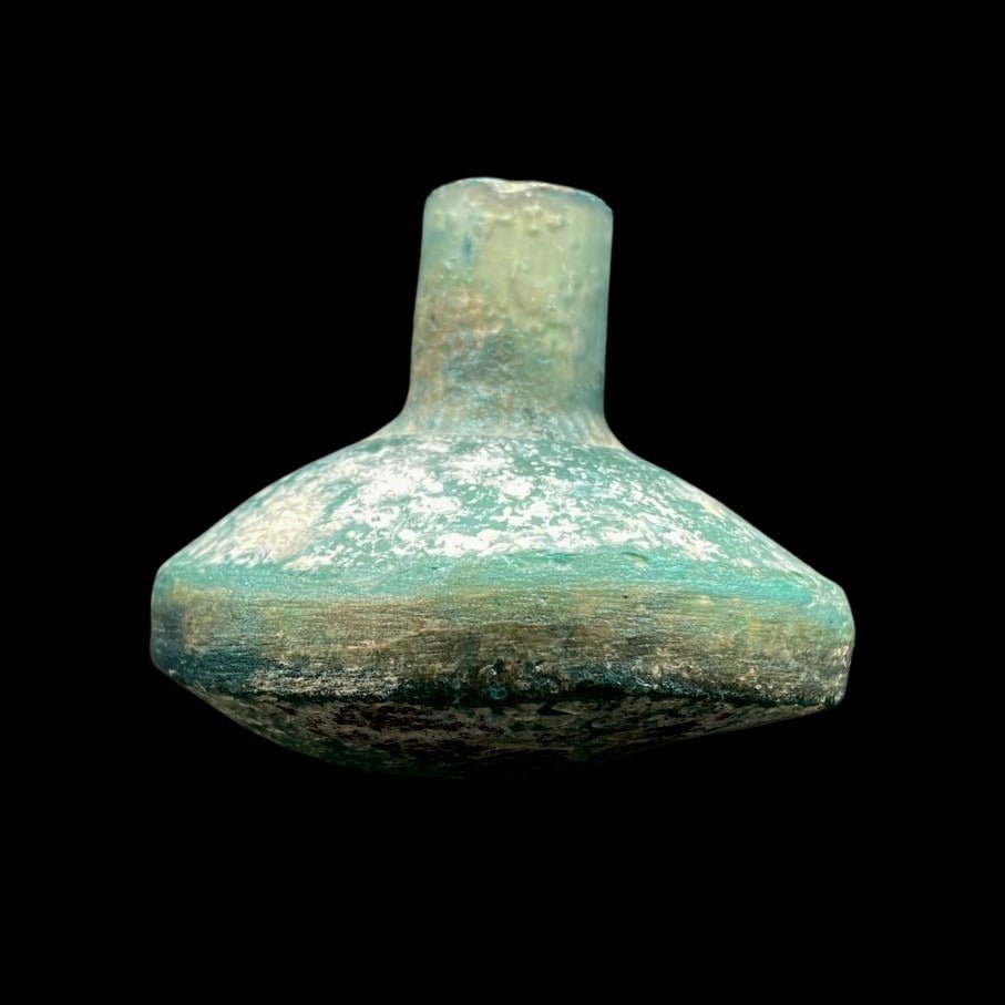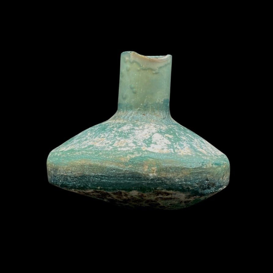 This is a one of a kind and must have piece! This very unique and very old antique Roman glass bottle fits in the palm of your hand and is teal color. It either has dirt or some of whatever that was kept in this bottle still in it. The bottom of the bottle has an iridescent shimmer and glow to it also.