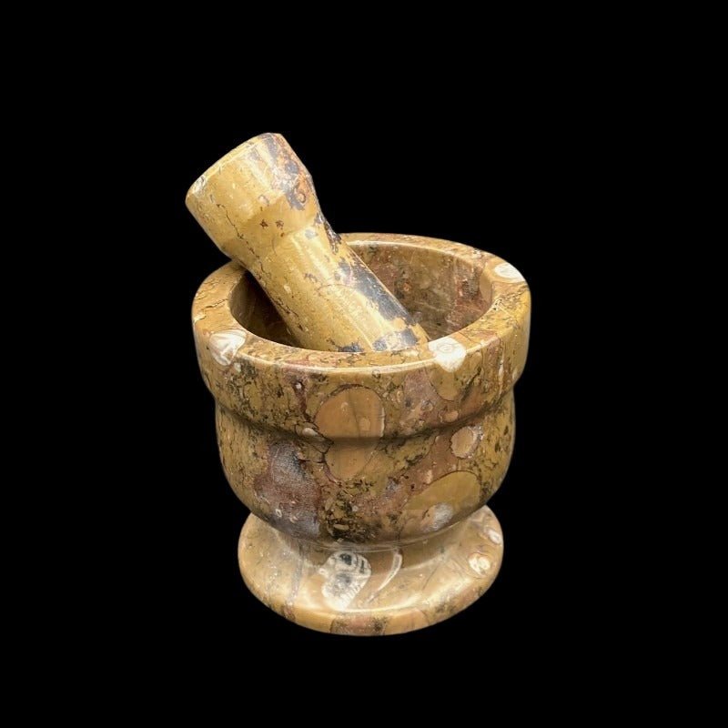 This small fossil mortar and pestle set perfectly blends functionality and aesthetics. Hand-carved from natural fossils, this piece will make a stunningly unique addition to any home decor while also serving as a practical kitchen utensil that inspires culinary creativity. A mortar and pestle is used for multiple purposes. They are excellent for crushing pills, muddling mint for a lovely mojito, crushing dried chili pods, or grinding any spices. The natural colors displayed throughout this mortar and pestle are cream, tan, brown, gray, and black.