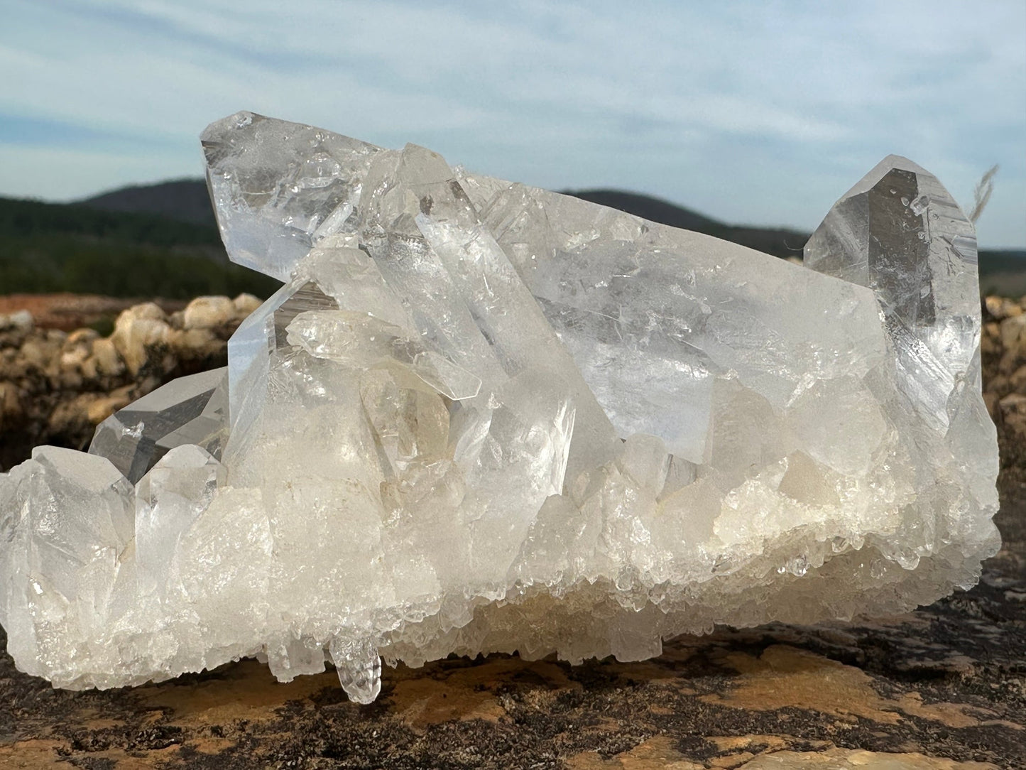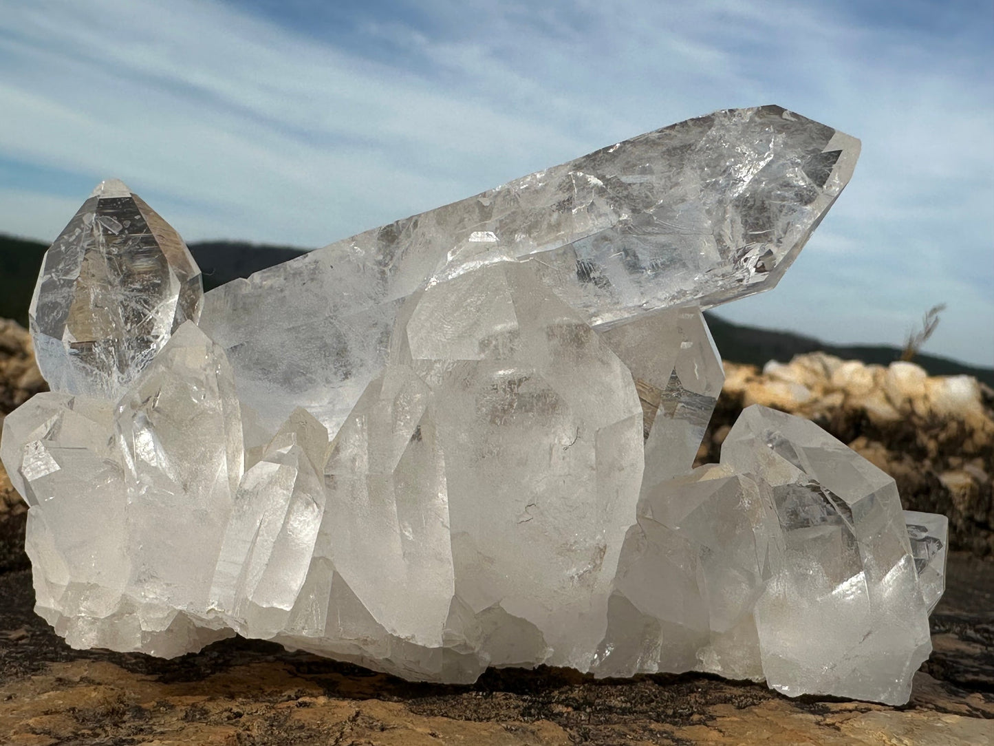 All crystals from our mine are never cut or polished. They have only been cleaned. Use this specimen as mineral home decor to add sparkle to your room, or place it in the sun for 24 hours for crystal healing. Please note that this quartz crystal cluster has a glass back.
