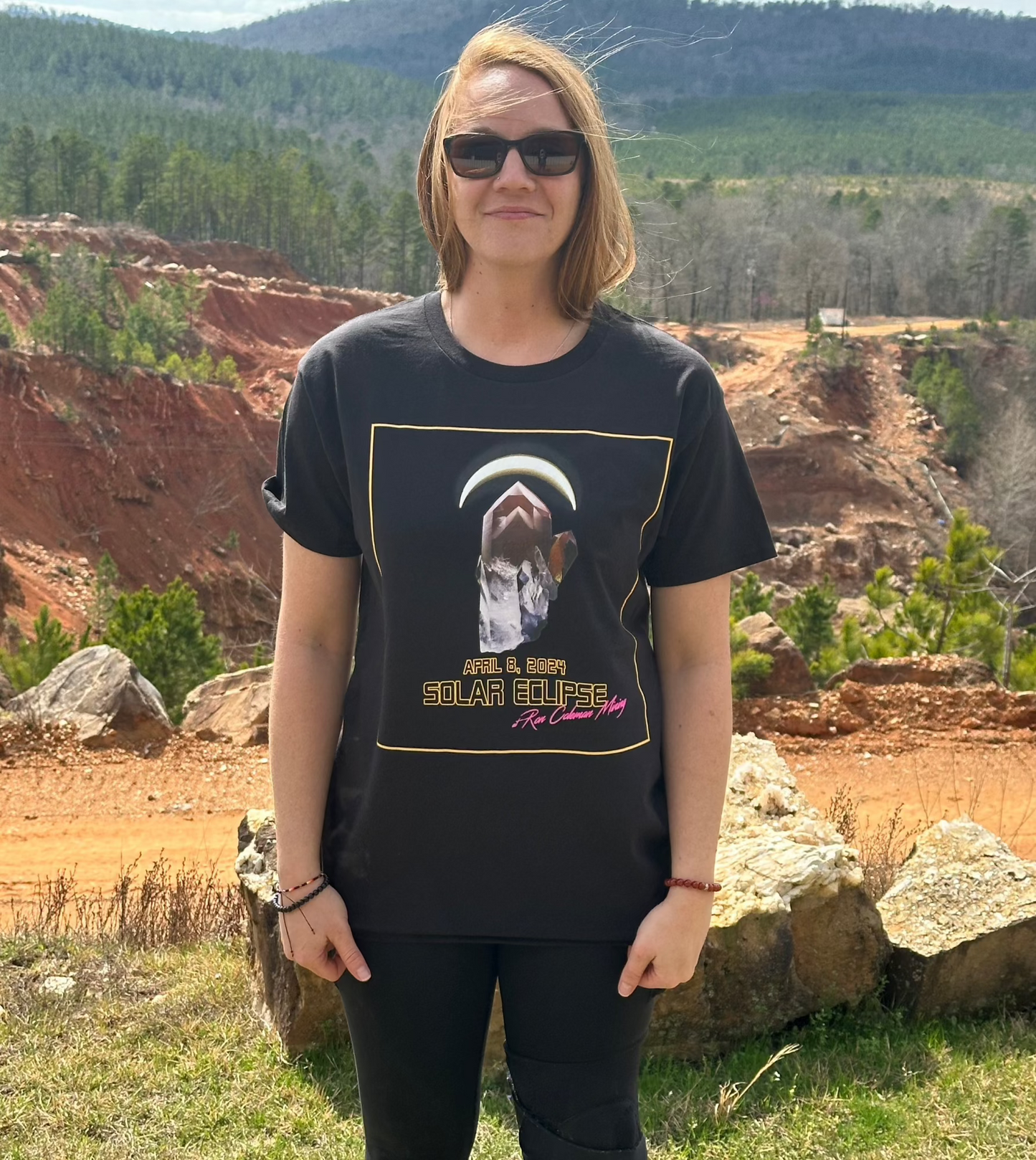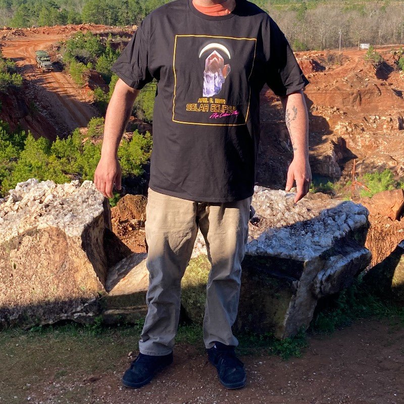 Buy this limited edition, Ron Coleman Mining, April 8, 2024, Eclipse commemorative shirt. It is a comfortable, black, unisex, short-sleeve shirt with a large crystal point graphic and a 75% eclipse phase directly over the crystal. Celebrate digging at Ron Coleman Mining during the historic April 8, 2024, Great North American Eclipse with this fun and creative shirt. There are no graphics on the back.