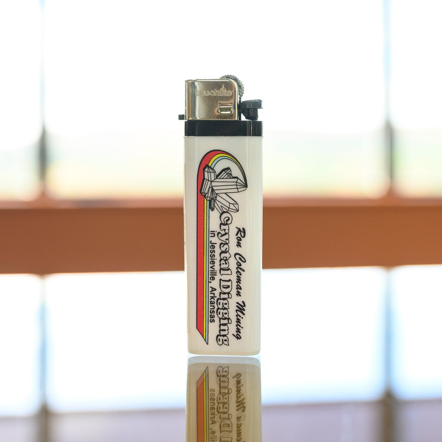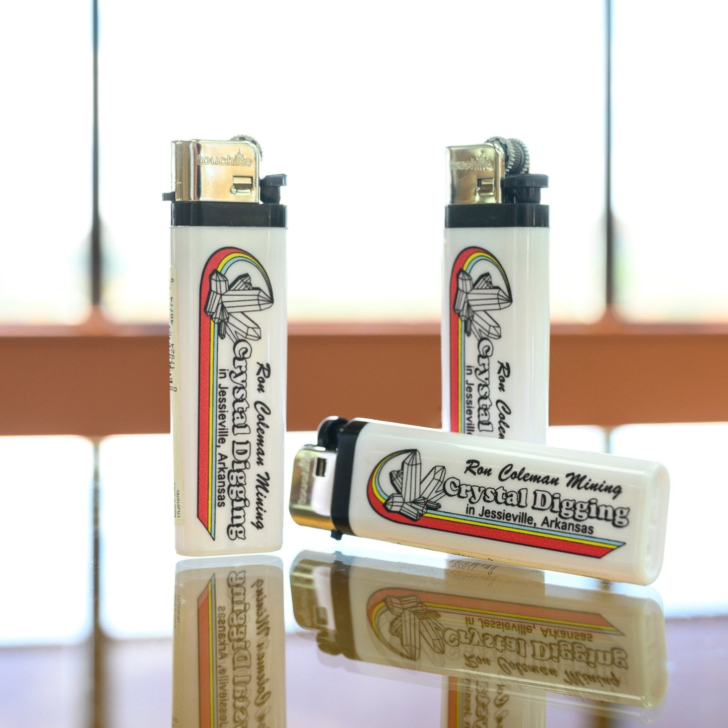 Branded white lighter with quartz crystal cluster graphics and Ron Coleman Mining Crystal Digging. We all need a lighter on hand. Why not get one that brings back fun memories of your crystal digging, zip-lining or camping experience at Ron Coleman Mining. We use the colors of the rainbow in our logo. "Crystal DIgging In Jessieville, Arkansas" is also placed on this cute lighter.