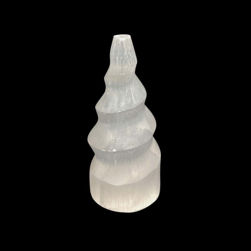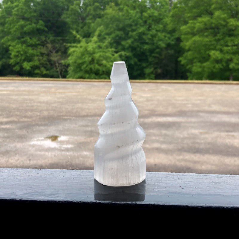 Selenite is a naturally white variety of Gypsum that forms translucent crystals. This Selenite spiral tower twist will make a sparkling white home decor accessory for any space in your home or office. It is carved and polished Selenite that displays the carved mineral to have a shiny and reflective surface. This decor accent will bring any room together and add a touch of elegance to your home.