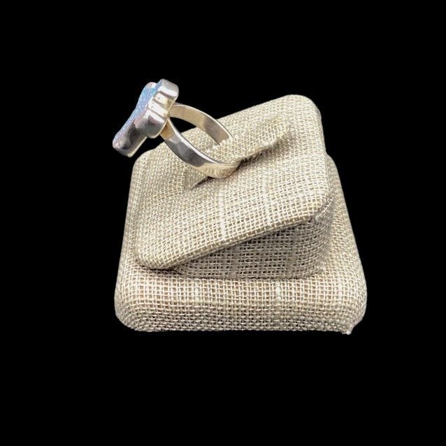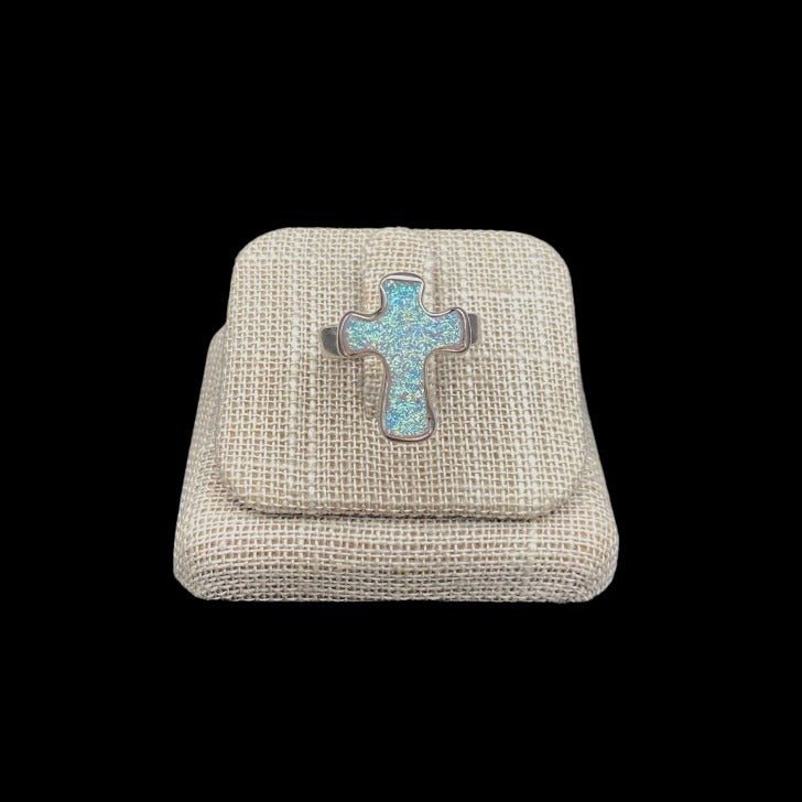 This Sterling Silver and iridescent cross ring is an eye-catching fashion accessory that combines quality sterling silver with an alluring iridescent drusy cross. A trendy piece of jewelry, it is perfect for adding a touch of elegance to any outfit.