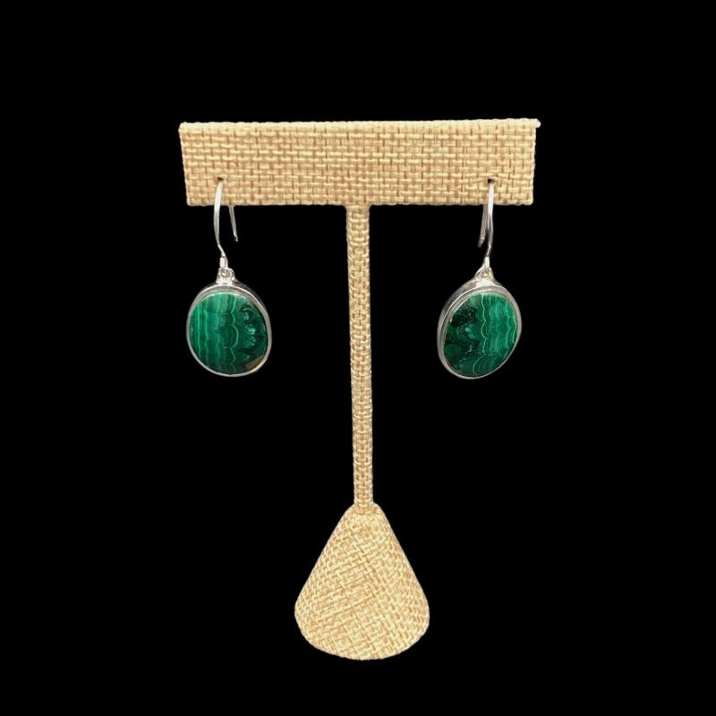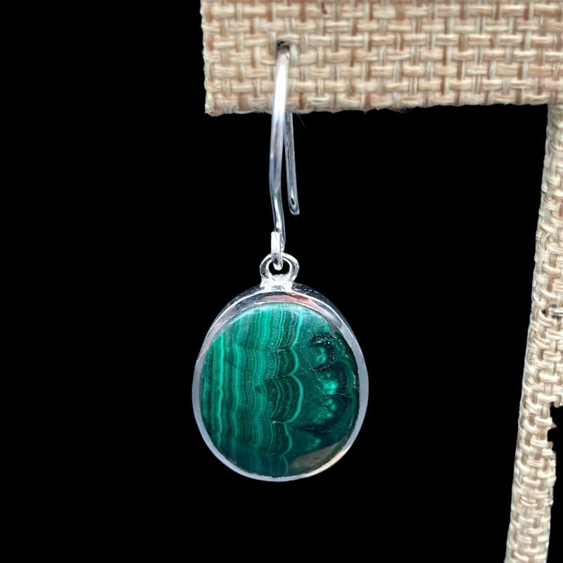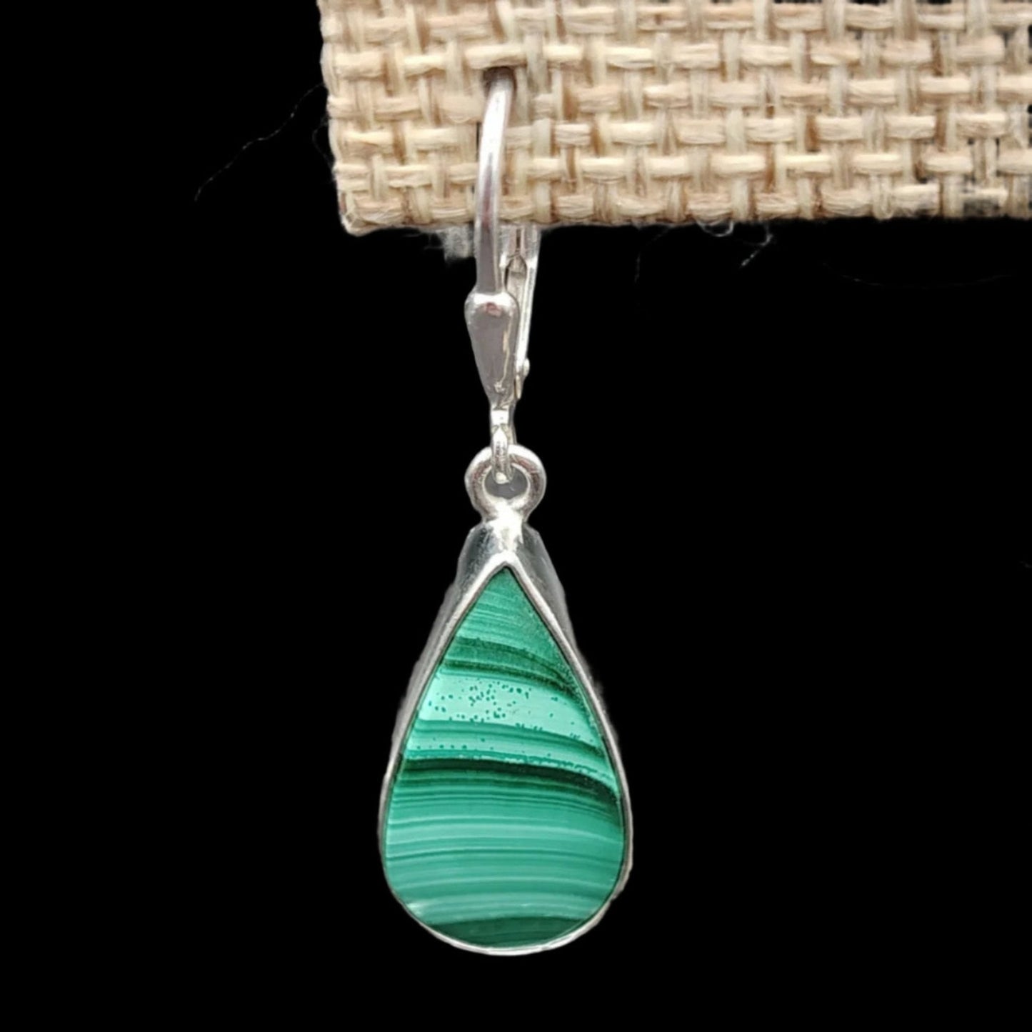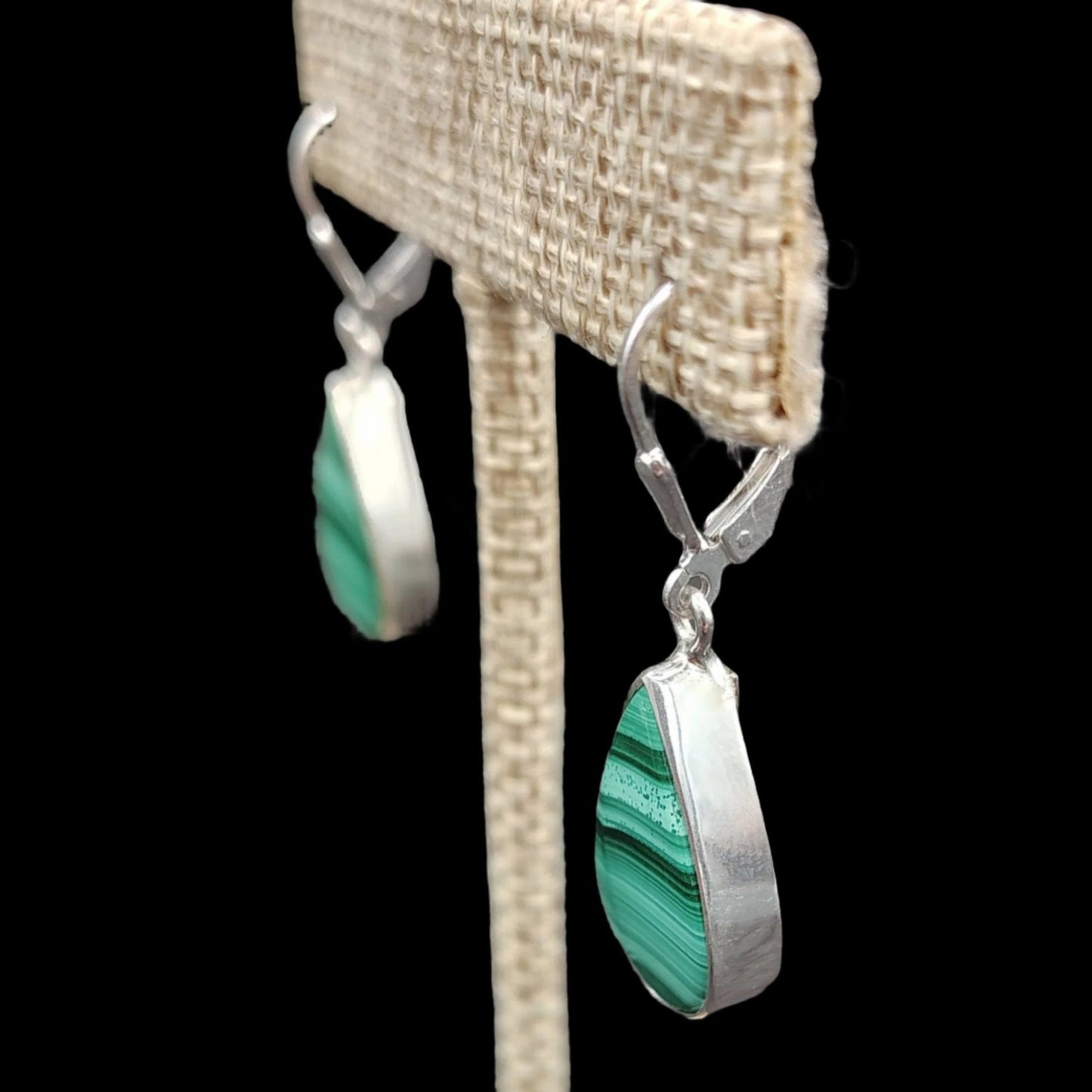 The stone is the focus of these minimalist style, sterling silver, dangle earrings. Malachite gemstone earrings are the perfect accessory for any look. Made of 925/sterling silver. A lapidarist's hand cut the Malachite in a teardrop-shaped cabochon cut. Cabochon cut meaning: This refers to a method of cutting gemstones with a rounded or convex surface that is polished but not faceted. A jeweler hand-cut the sterling silver sheet wire to custom fit the Malachite and set the stones in this most secure mounting/setting. The sterling ear wire is a French wire style with an open back. These earrings are sure to make a lasting impression.