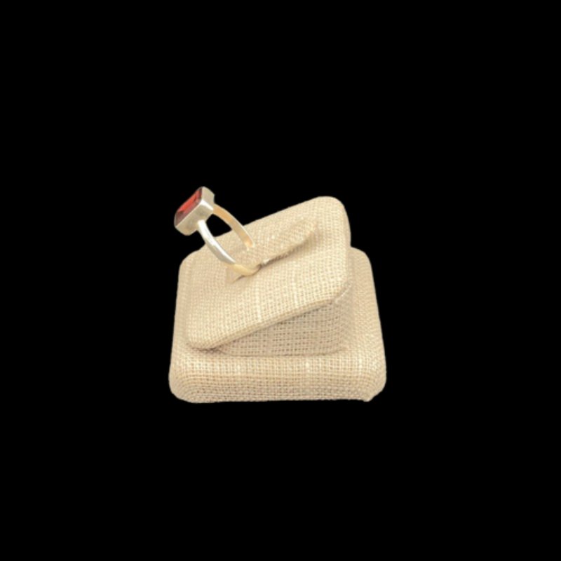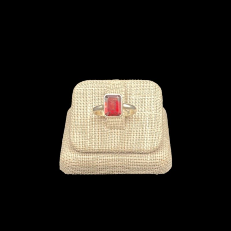 This Garnet gemstone ring is Sterling silver. The gemstone is a rectangular or emerald cut Garnet. All around the edges and the sides of the gemstone itself is a bezel that securely holds the gemstone.