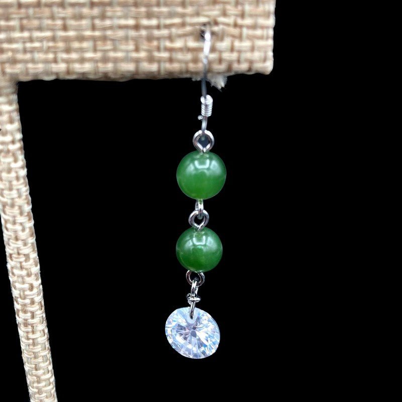 Each earring has 2 round green jade beads and 1 Cubic Zirconia stone.
