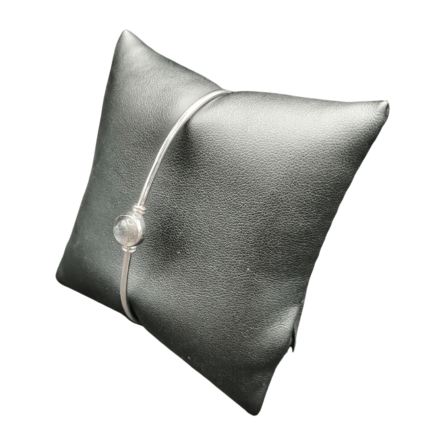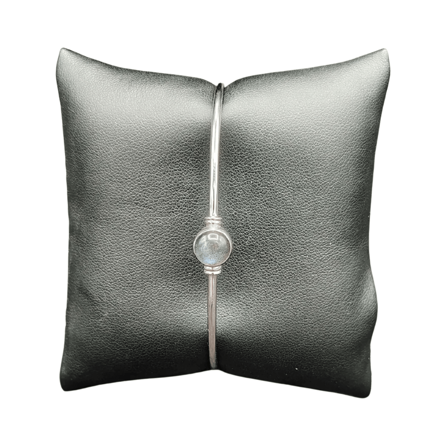 This Sterling Silver and Labradorite gemstone cuff bracelet is finely crafted with a highly polished finish. It features a genuine Labradorite gemstone displayed on a Sterling Silver cuff bracelet. This bracelet will make a unique and timeless addition to your jewelry wardrobe. It is simple and elegant for everyday wear or an evening out. Notice the natural blue/gray color.
