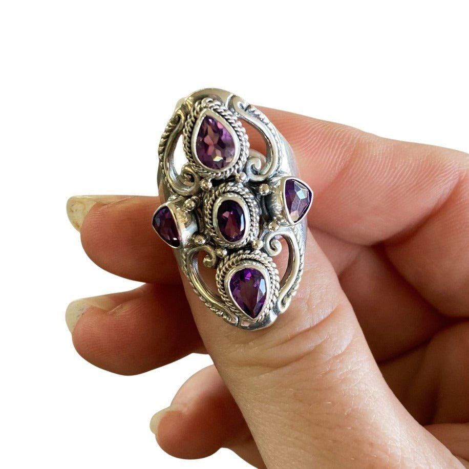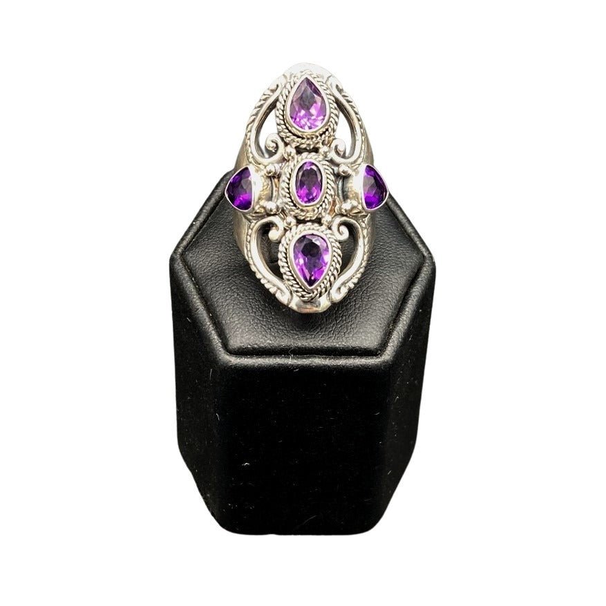 This stylish sterling silver and amethyst gemstone ring is designed to give wearers a fashionable look. The delicate, oval cut amethyst provides a classic look that is timeless and elegant. This gorgeous, high-quality jewelry can make any ensemble stand out.