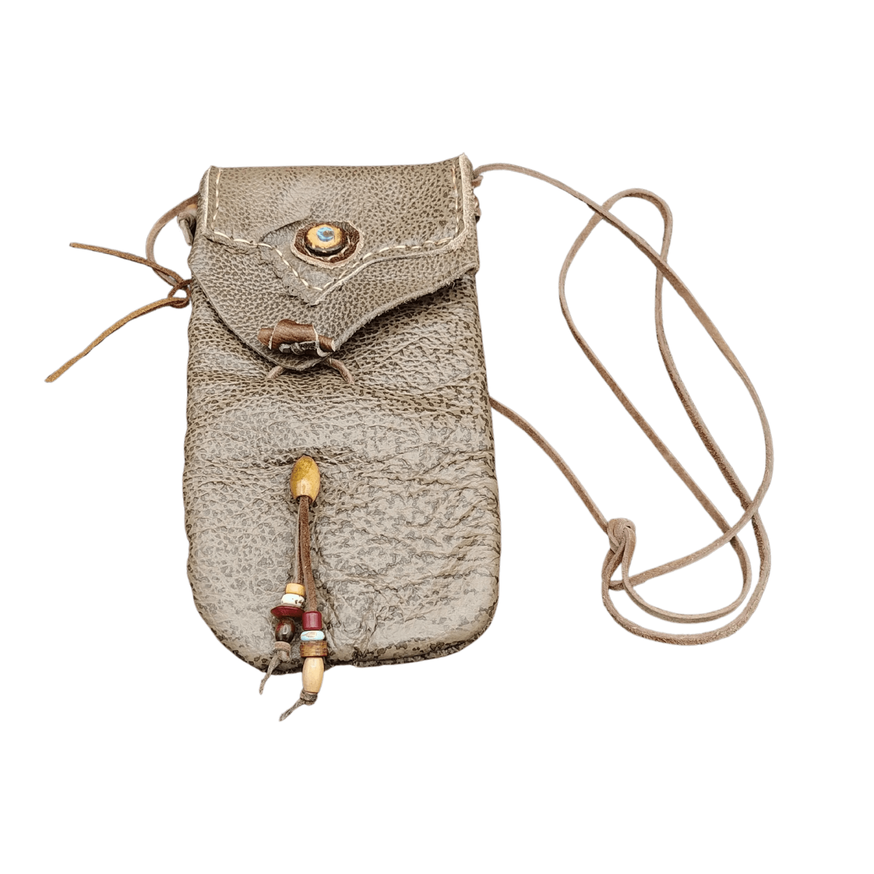 This particular pouch is made out of a variety of mostly taupe colored leather, with a touch of blue, orange, purple, and some earth tones as well. This leather pouch is truly unique. Each one is handmade; therefore, it's one of a kind.