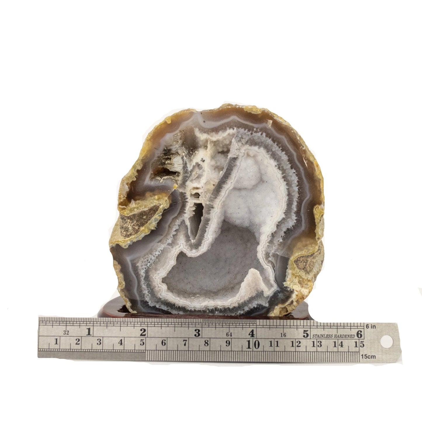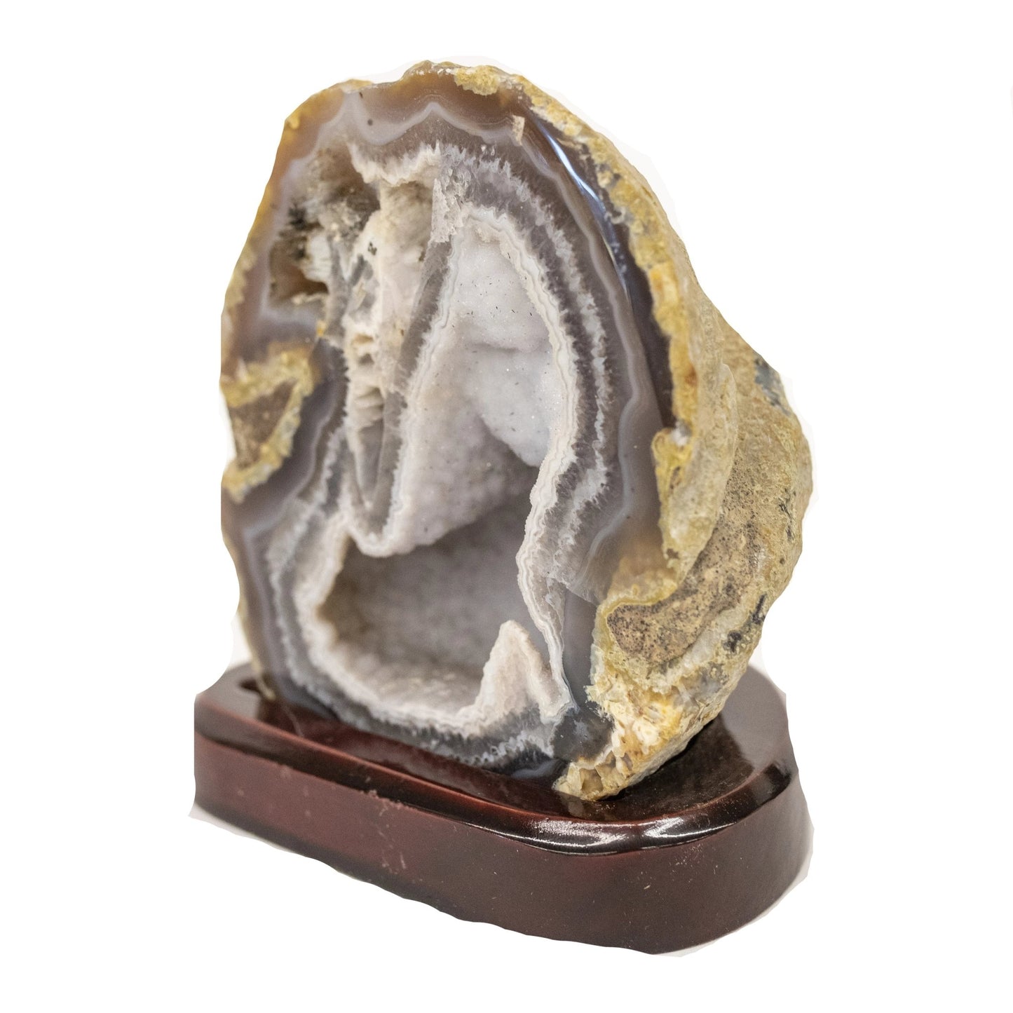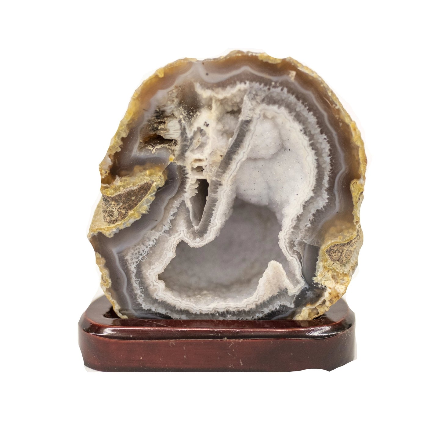 Beautiful brown Agate with brown druzy crystals on a wood base that is cherry wood tone. This budget mineral décor is the perfect size for a side table, bathroom space or on a fireplace mantle. It is a versatile décor accessory that would look wonderful with rustic-style design, minimalist and curated styles.