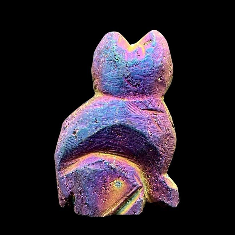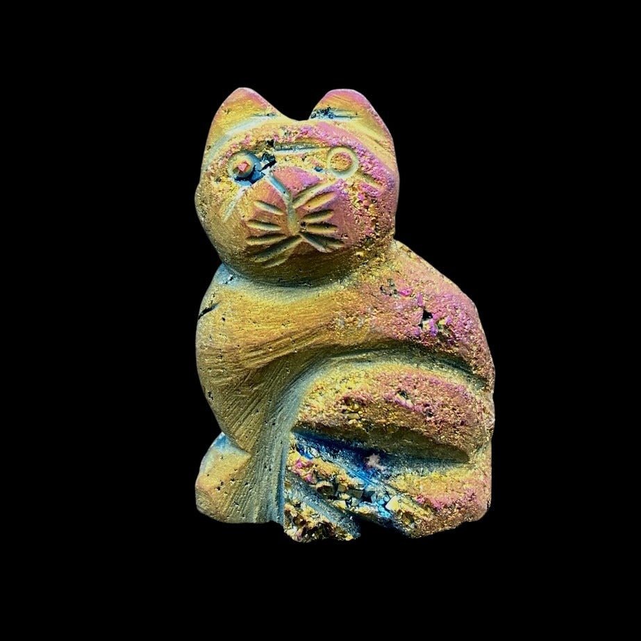 This is a truly unique little figurine. This is a Titanium coated Agate geode that has been shaped into a sitting cat figurine. No matter which angle that you turn this figurine, it sparkles brilliantly! It has all the colors in the rainbow, that just adds so much more to the sparkle.