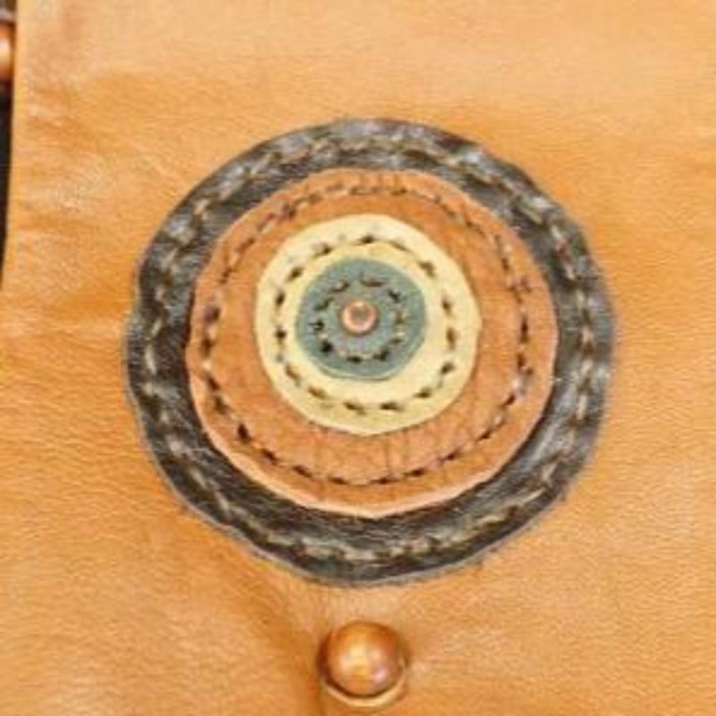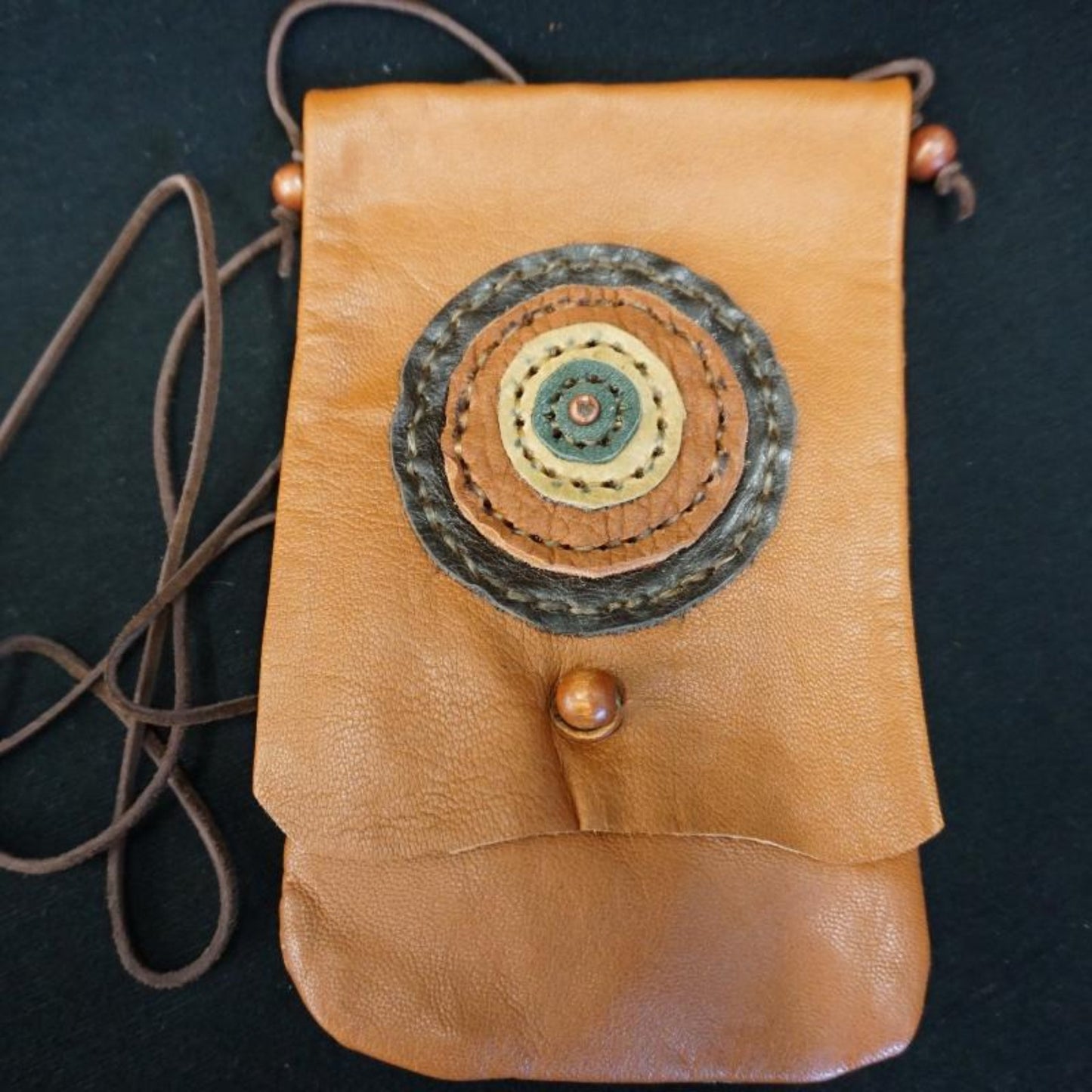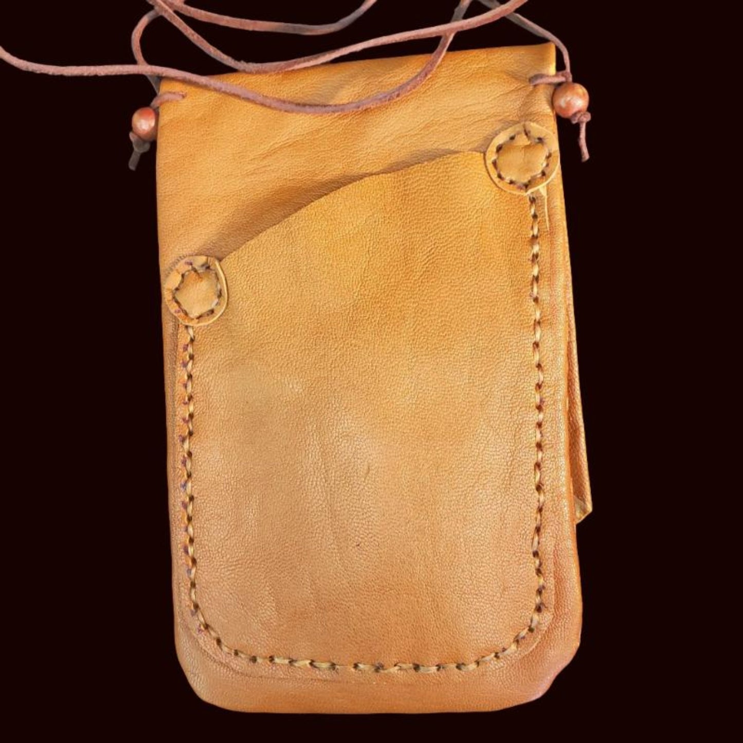 Handmade in Arkansas from real leather. This mini tan leather purse has a beautifully stitched leather design on the front. Large enough to hold a cellphone or just your essentials. Small pocket on the back. Color: Tan/Brown