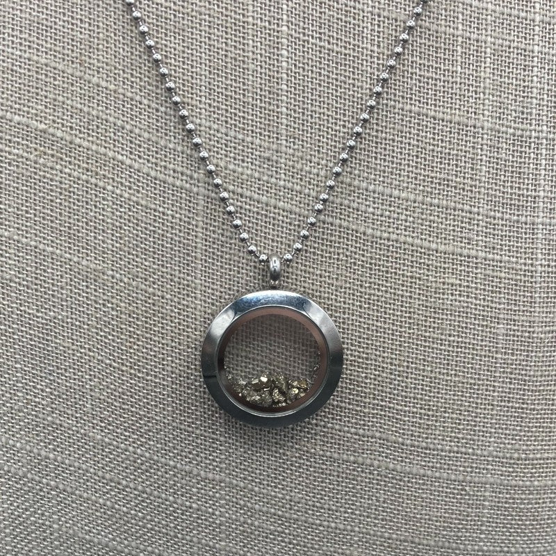 This exquisite necklace was assembled at Ron Coleman. Stainless steel Pyrite Locket Necklace is an absolute must-have! The pyrite pieces are visible in the glass front and back of this locket. This necklace is sure to be a timeless piece that you can enjoy for years to come. Don’t miss out on this dazzling locket!