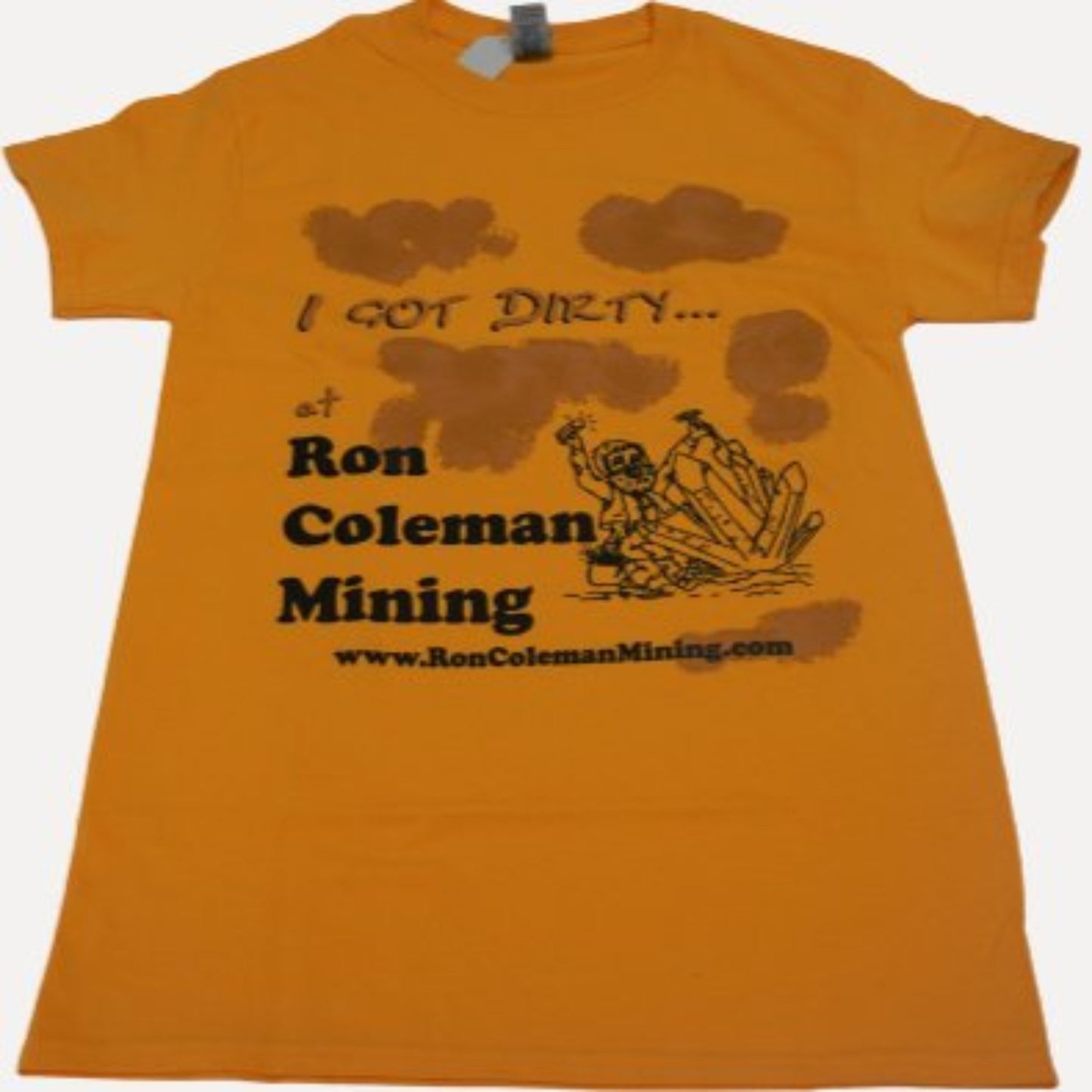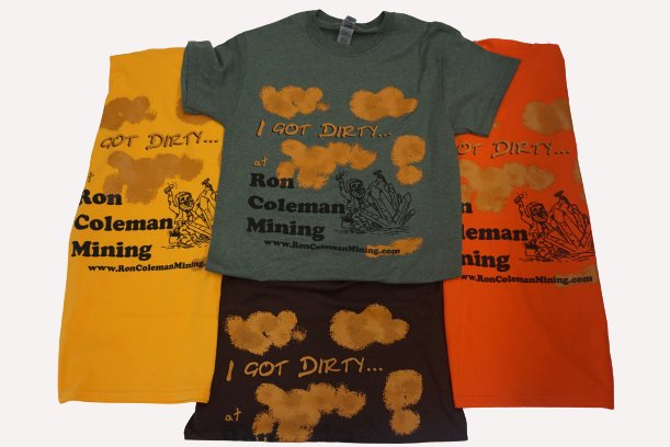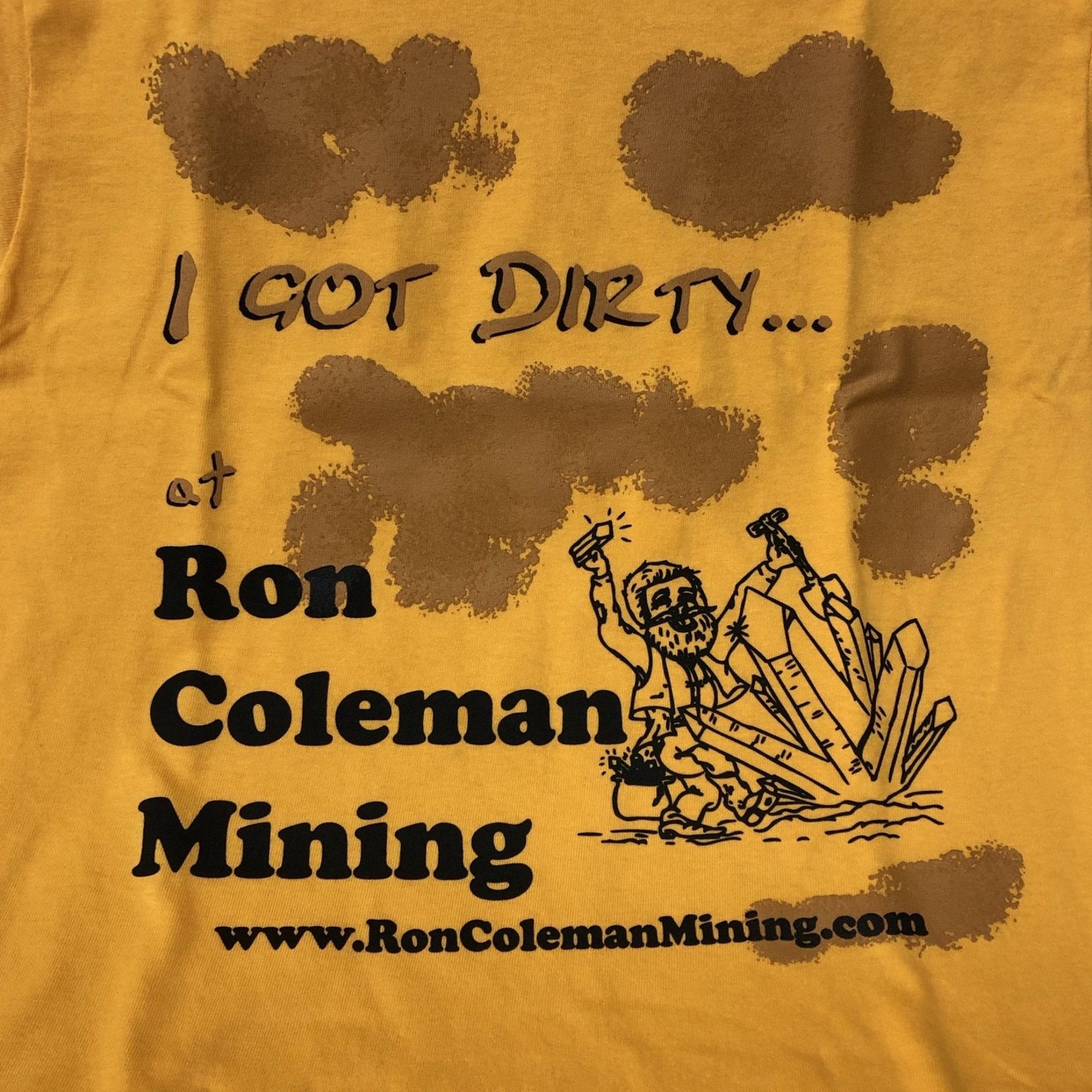 Buy a unisex t-shirt commemorating your visit. It’s a reminder you “Got Dirty at Ron Coleman Mining. This short-sleeve t-shirt is gold with brown and black graphics. We use the "I Got Dirty" slogan because a person who actively digs in the dirt for quartz will get very dirty. Check out our Facebook page to see images of people showing off the quartz they found during their daily dig. #igotdirtyatroncoleman